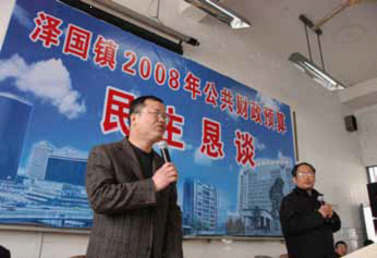 2008 年,正在温岭市泽国镇预算恳谈上,镇长王晓宇回覆的提问。摄影/ 俞良德 王迪青!