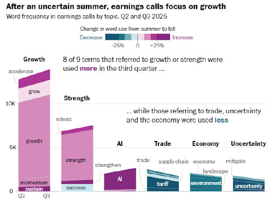 一张图表展现了 2025 年第二、三季度财报德律风会议中,分歧类别词汇的利用频次。此中,且环比呈现增加;“增加” 类词汇的提及次数位居第二,其余四类词汇的提及总量附近,但变化趋向有所分歧:人工智能相关词汇的利用频次上升,相关词汇的利用频次根基持平,而涉及不确定性、商业及经济的词汇利用频次均呈现下降。代表 “增加” 或 “韧性” 的 9 个词汇中,有 8 个正在第三季度的利用频次有所添加……
