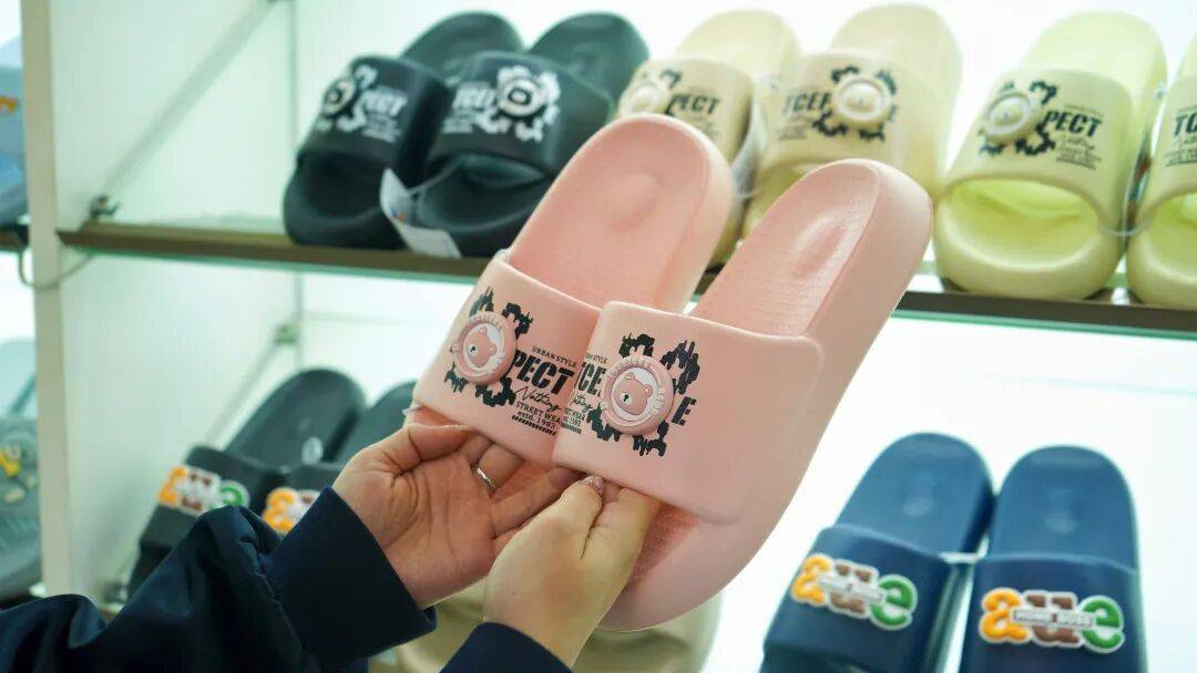 刚踏入顺通鞋业的展厅,仿佛来到了一个微缩全球鞋业博览会。从典范适用的人字拖、洞洞鞋,到设想新鲜的厚底拖鞋、功能型浴室拖鞋,数百款鞋品参差有致地陈列正在展架上。